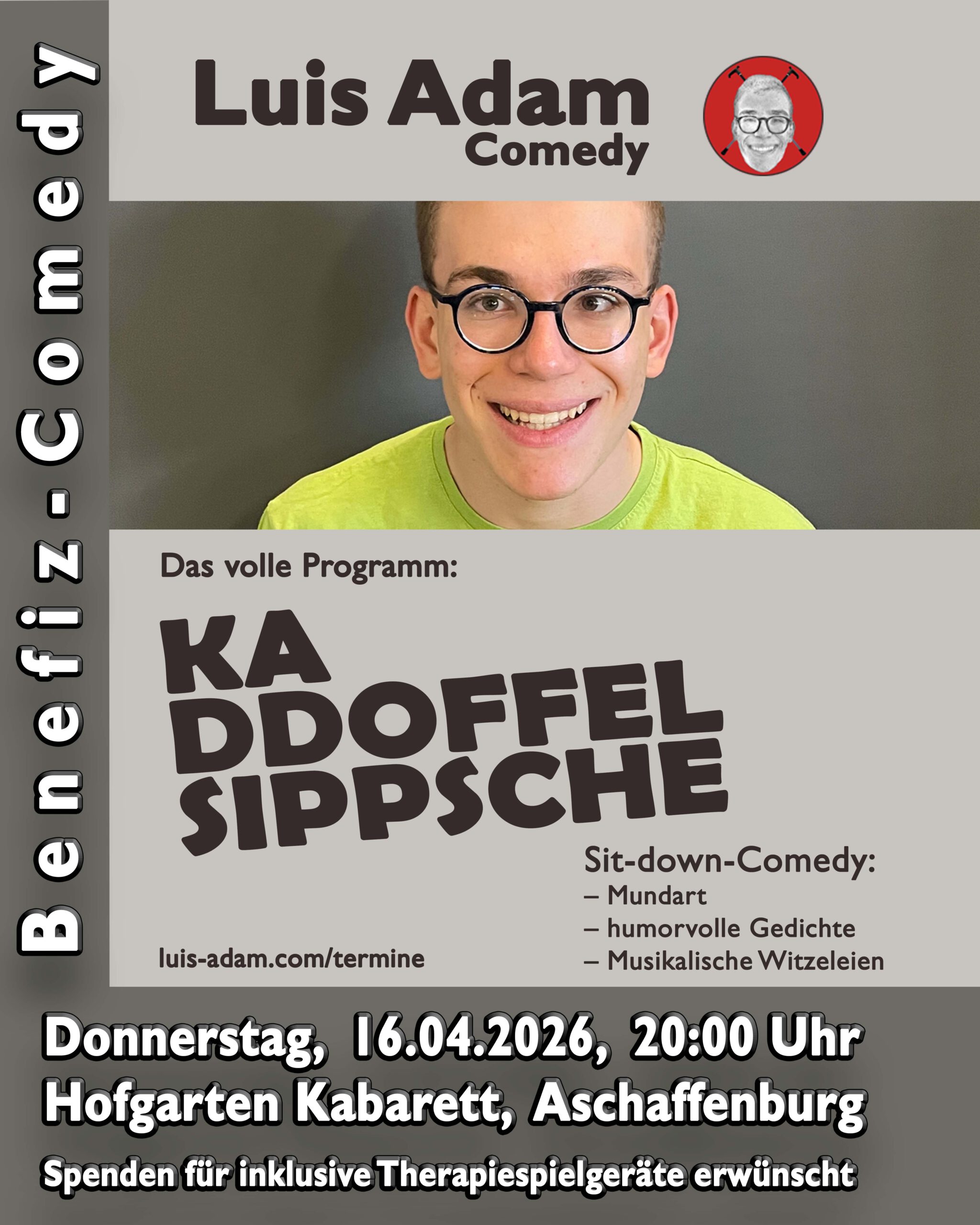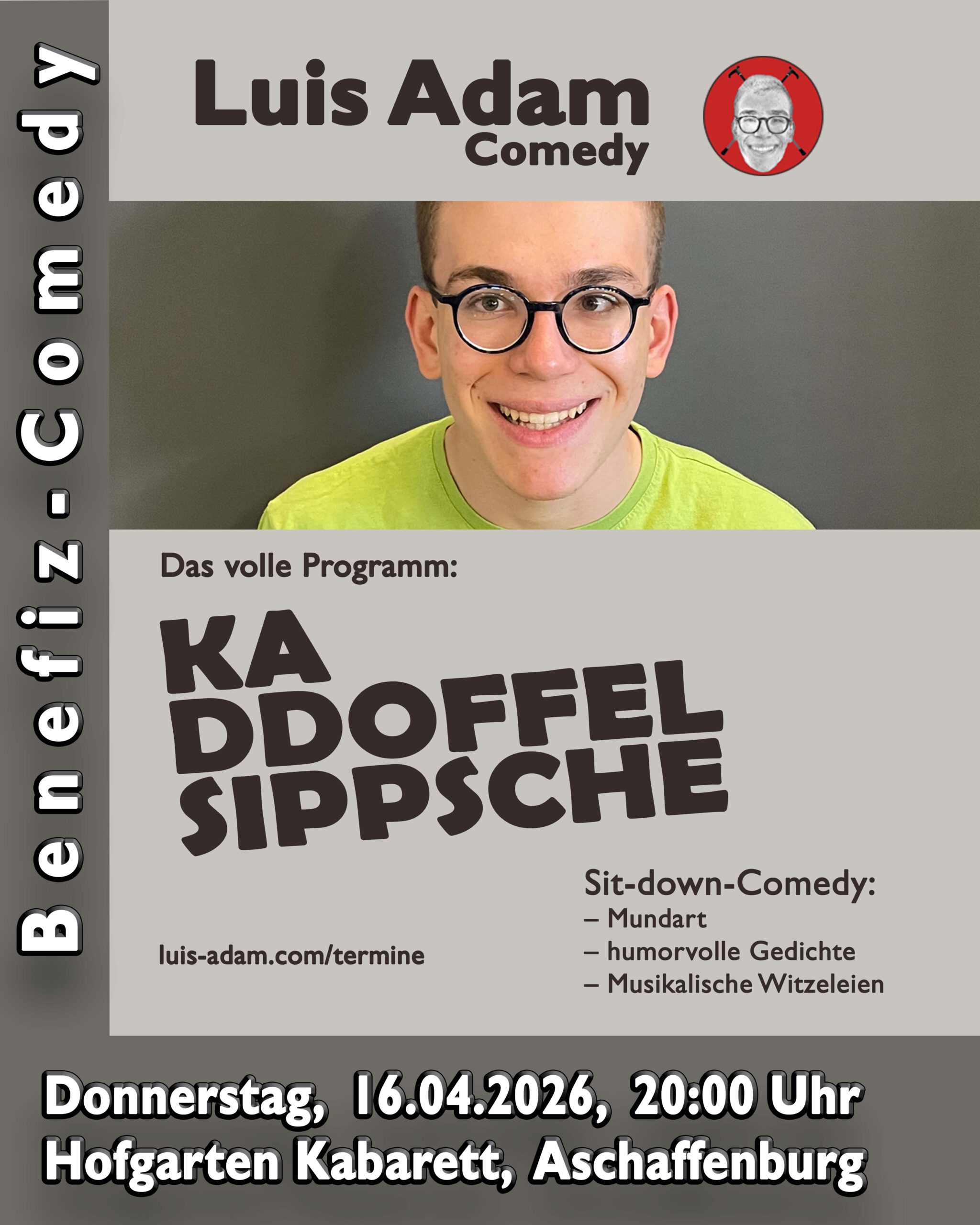 Wenn man Luis Adam fragt, wo er herkommt, dann muss er ganz weit ausholen: Zwar lebt der gebürtige Hesse in Bayern, doch das zählt nicht, denn schon 100 Meter weiter steht er auf hessischem Boden. Daher ist er zweifellos ein waschechter Hesse und babbelt, wie ihm „die bambelisch Schnuud gewachse is“. Aber auch andere Dialekte packt er in seinem Programm „Kaddoffelsippsche“ aus: Welche Parallelen gibt es vom Hessischen zum Schwäbischen? Und wie verhalten sich Kölner gegenüber Frankfurtern? Wie ergeht es einem Behinderten an der Front? All das – und noch viel mehr – verarbeitet er in einem Feuerwerk aus humorvollen Gedichten, Musikparodien sowie eigenen Songs. Aufgrund seiner Gehbehinderung lässt sich diese knallbunte Mischung wohl treffend als „Sit-down-Comedy“ zusammenfassen.